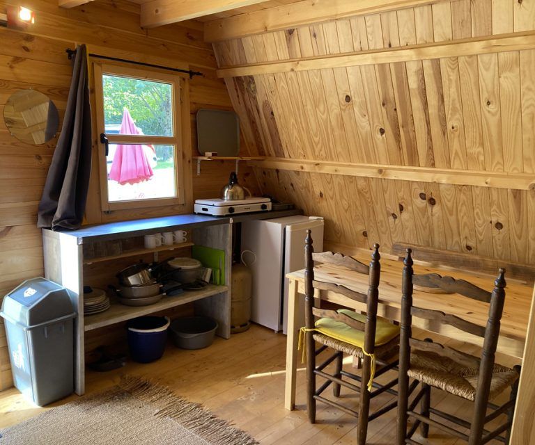 Pièce à vivre avec coin cuisine: réchaud gaz 2 feux, frigo, rangements, vaisselle