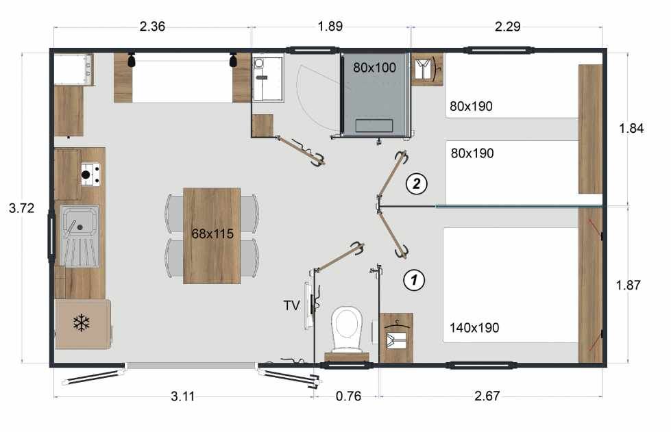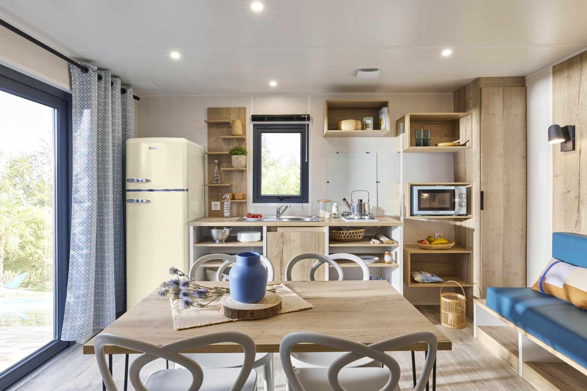 De accommodatie biedt een comfortabel en gastvrij interieur, met alles wat u nodig heeft voor een geslaagd gezinsverblijf. Kinderen kunnen in alle veiligheid de natuur verkennen, terwijl ouders genieten van een ontspannend moment in de schaduw van de dennenbomen of tijdens een maaltijd op het terras.